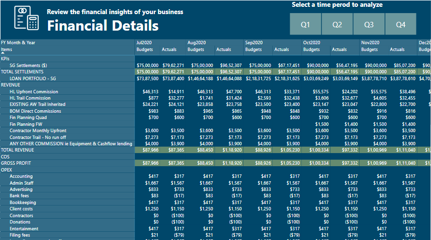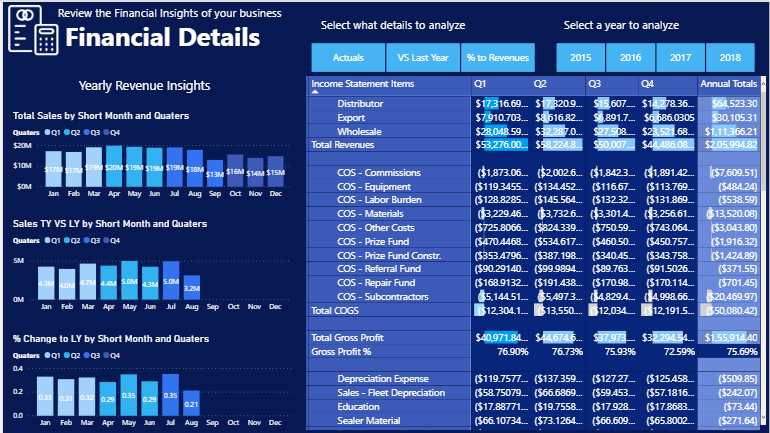 This report gives analytics about the Income Statements, Cashflow Statements, Balance Sheet, Financial Details, Aged Trail Balance and Revenue Insights.