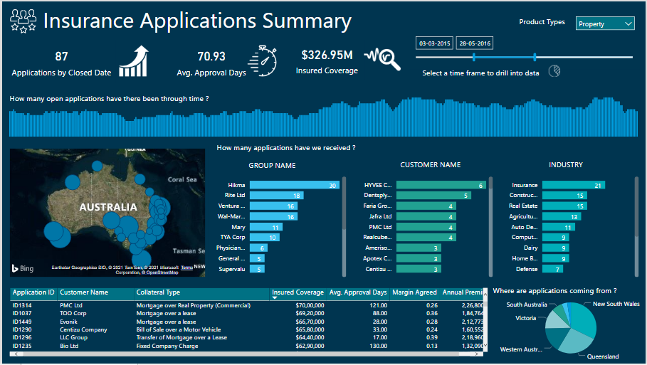 This report gives analytics about Insurance Applications, Average  Approval Days, Insured Coverage.