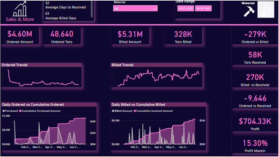 This report gives analytics about Purchase, sales, Bills Ordered, Billed Amount, Tones Billed and gross profit.