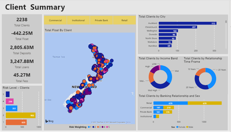 This report gives analytics about Banking Client Summary, Client Details, Retail, Commercial and Institutional Details.